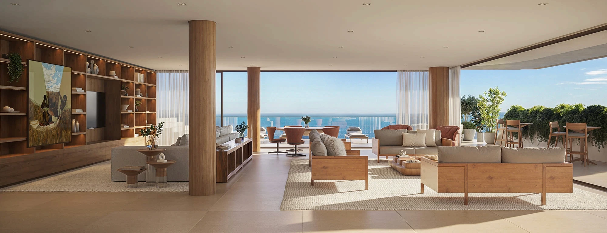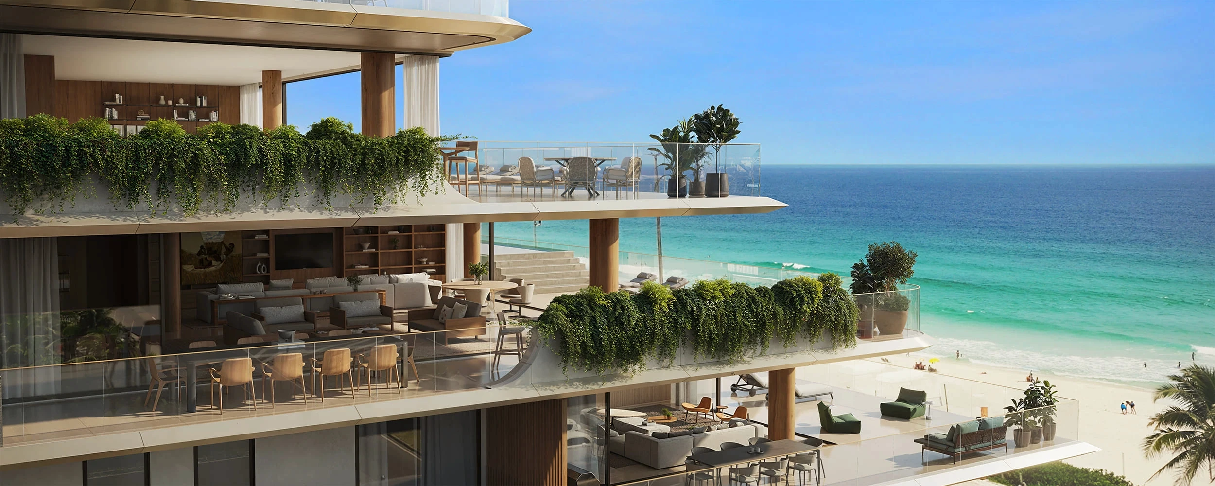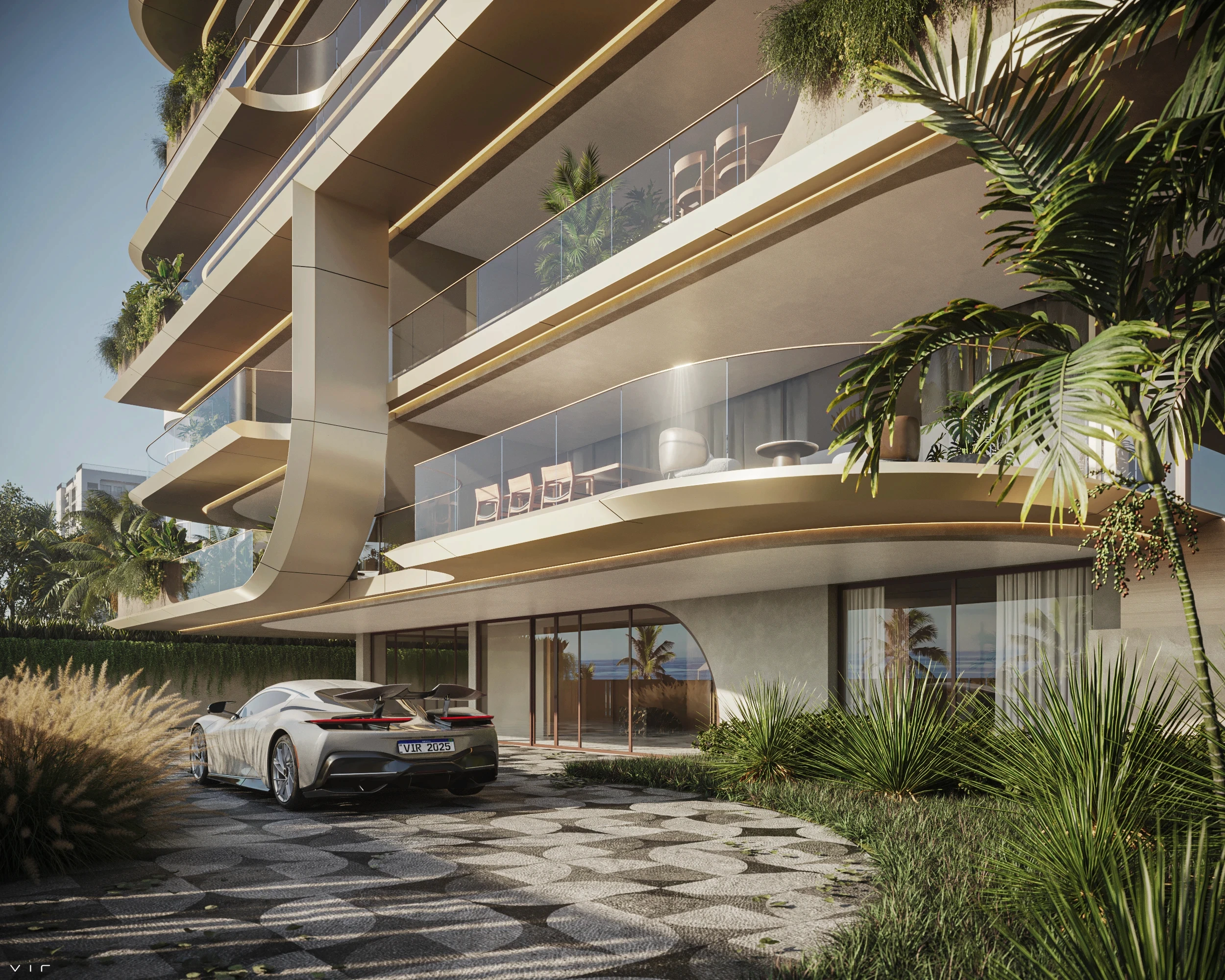 As varandas amplas, envolvidas por jardins contínuos, criam uma arquitetura que se abre para o horizonte.