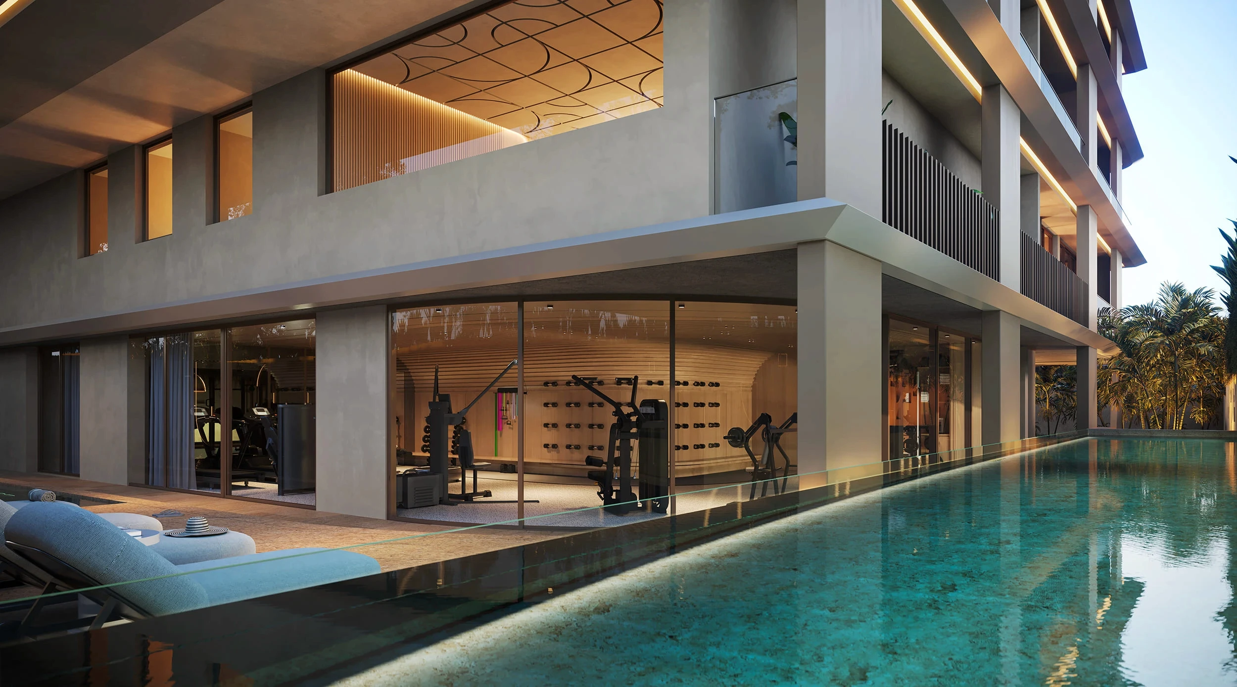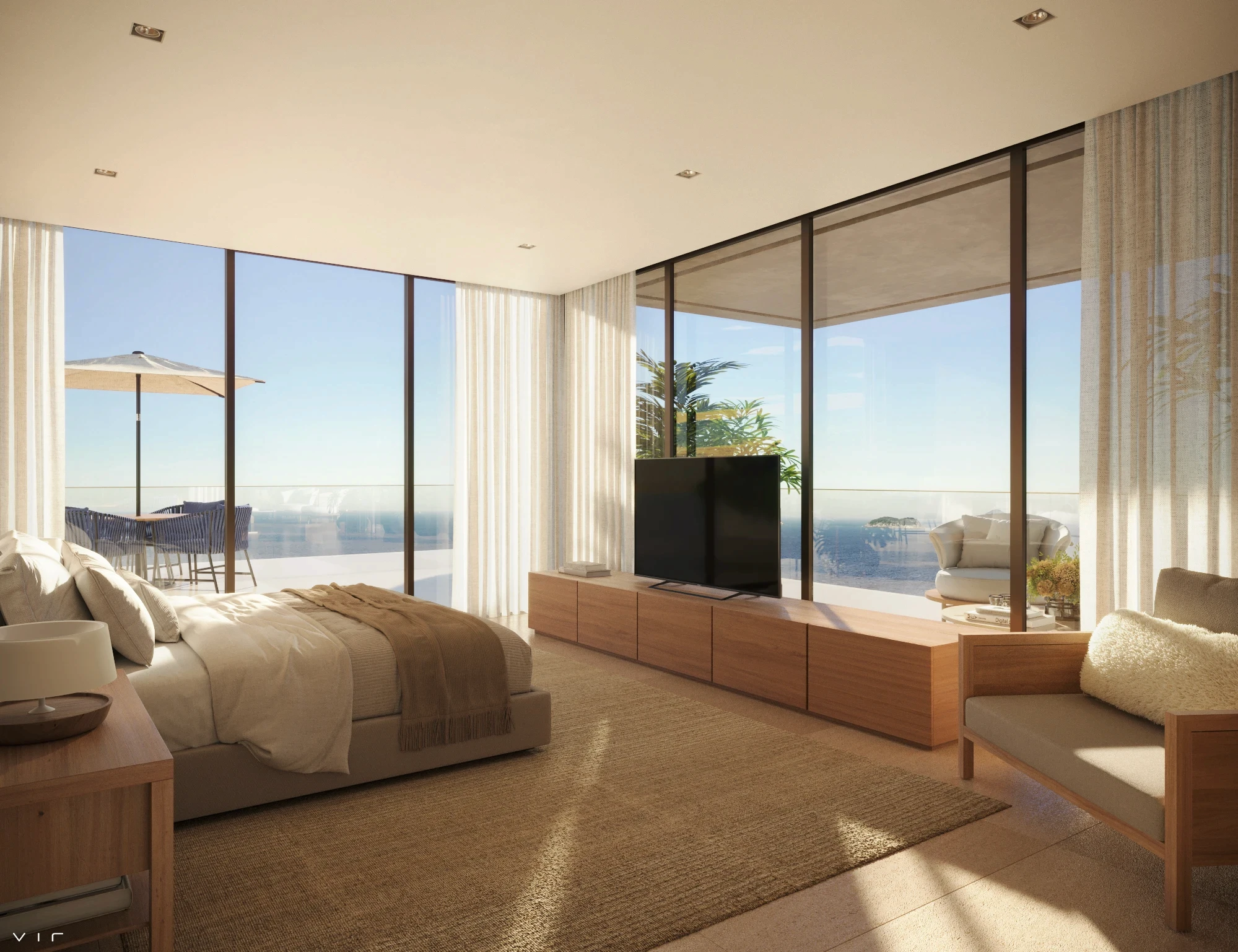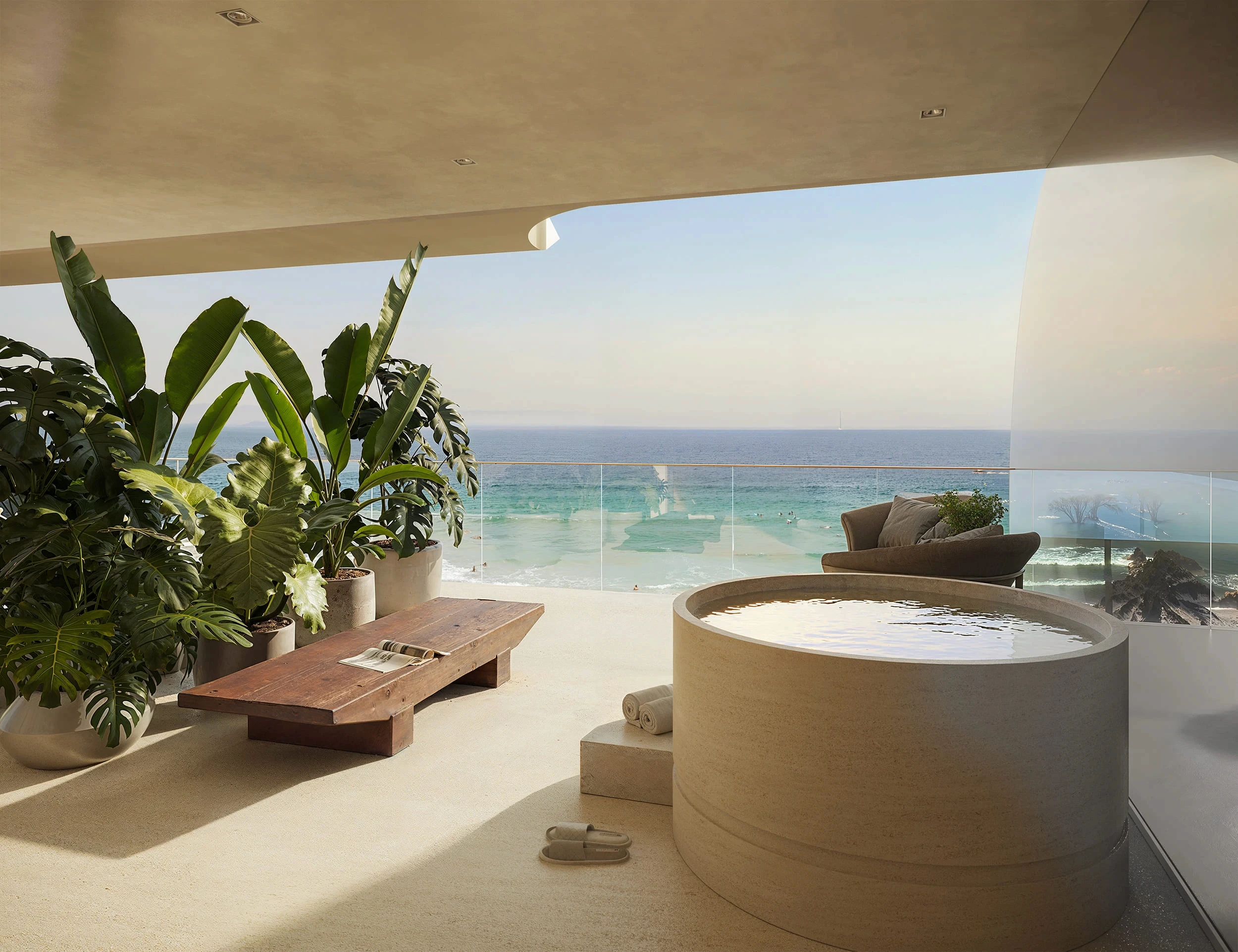 As varandas amplas, envolvidas por jardins contínuos, criam uma arquitetura que se abre para o horizonte.