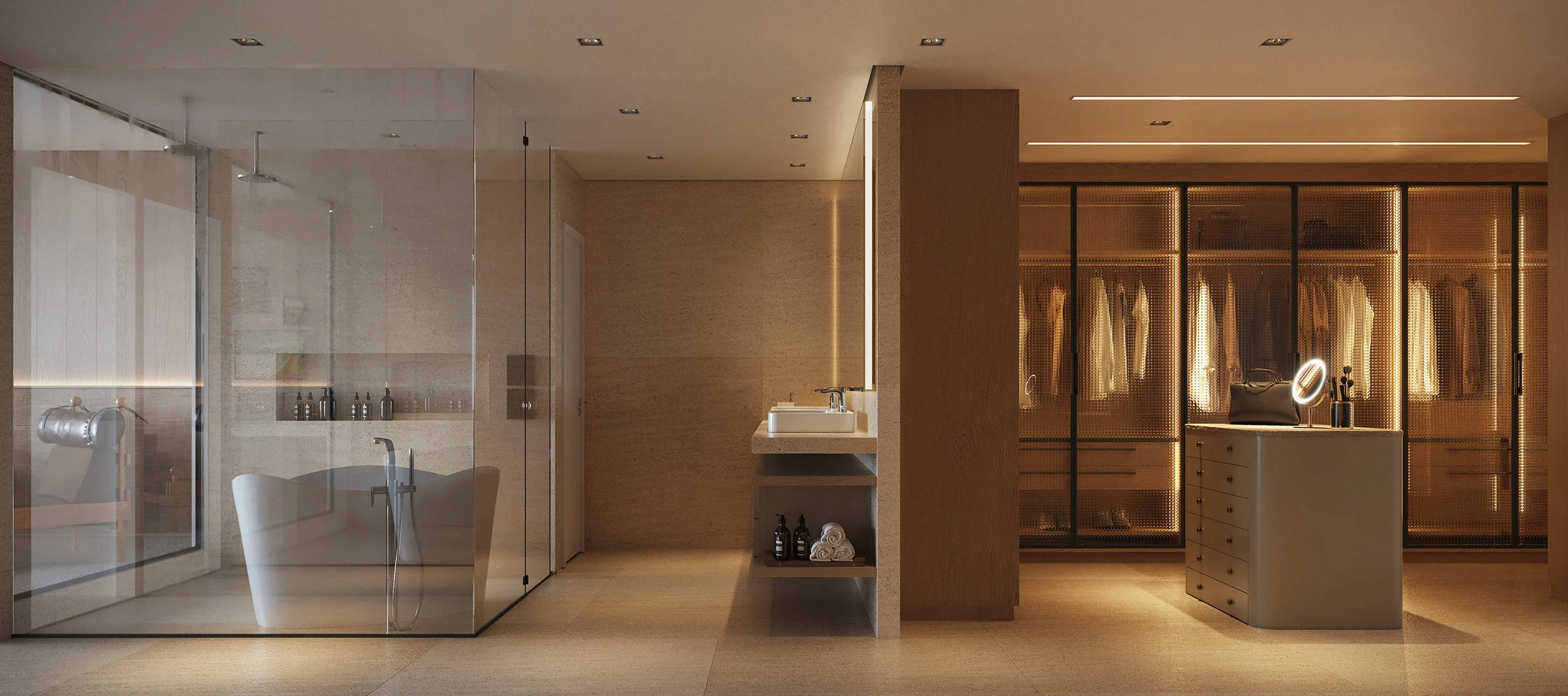 Cada ambiente foi iluminado para transmitir calma e profundidade, mantendo a vista para o mar como protagonista. As salas se estendem em terraços generosos; os quartos refletem um aconchego minimalista; e a área de spa e piscina sugere um tempo desacelerado.