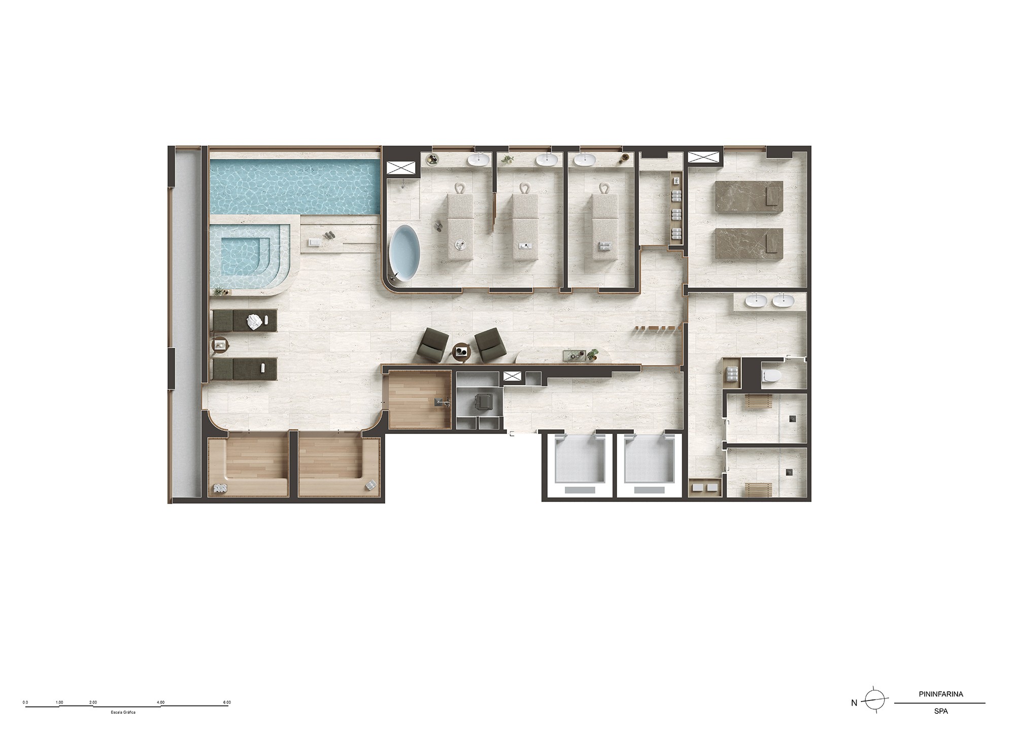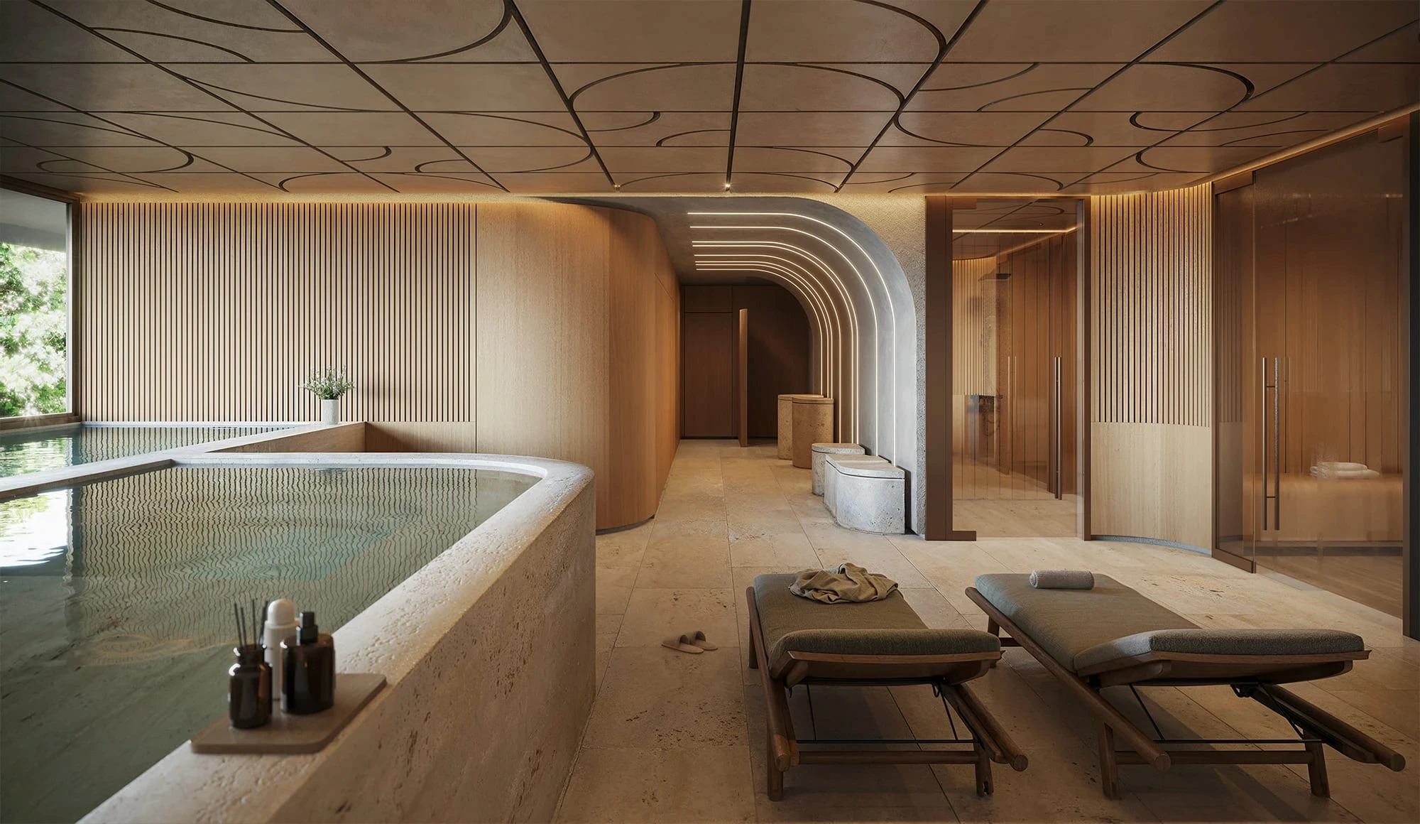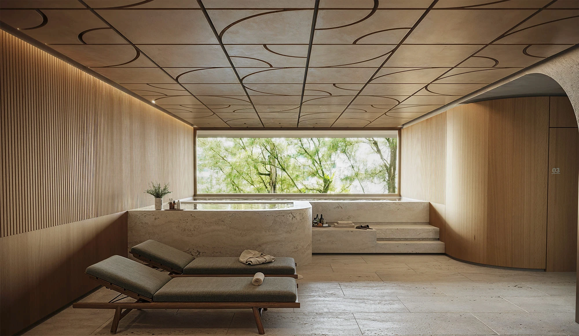 Nos interiores, a paleta de materiais — madeira natural, pedra, tecidos neutros — revela um luxo silencioso, que está mais ligado à qualidade e ao conforto que ao excesso propriamente dito.
